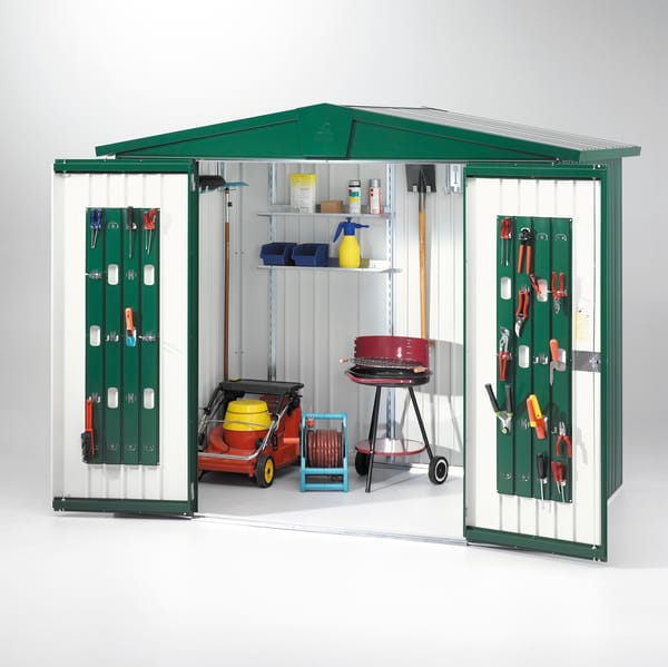 La dotazione di base dei nostri prodotti è estremamente completa e funzionale. Comprende una porta a due battenti con un sistema di allestimento integrato sul lato interno del pannello (inclusi 6 ganci porta attrezzi), 4 ganci porta attrezzi aggiuntivi, 2 ripiani con i relativi supporti, e due staffe supplementari per l’installazione a parete (per le misure 2A e 4A). Inoltre, i ganci per bloccare le porte aperte offrono un’ulteriore praticità nell’utilizzo quotidiano.