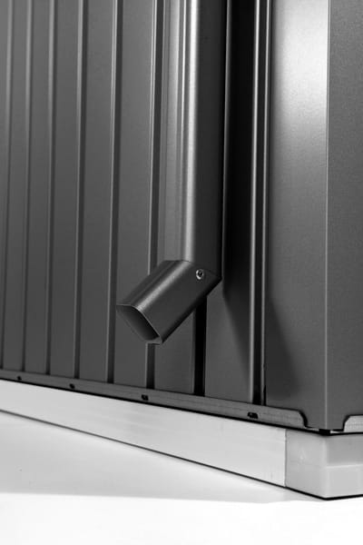 La struttura offre un’eccellente funzionalità grazie alla piastra in acciaio sottoposta a zincatura a caldo e verniciatura a forno poliammidica. Completano la struttura viti e cerniere in acciaio inossidabile che garantiscono durabilità e resistenza. Inoltre, la grondaia integrata con raccordo per tubo flessibile da 1″ offre un sistema di drenaggio efficiente e pratico.