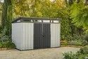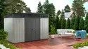 Casetta da giardino dal design contemporaneo realizzata con struttura a pannelli in Duo Tech, colore grigio, effetto legno spazzolato, rinforzata in metallo. La casetta comprende anche una porta a due ante lucchettabile, finestre su 3 lati e un pavimento rialzato che protegge il contenuto da fango e pioggia. Dimensioni: L 342 x P 218 cm, altezza del colmo: 226 cm.